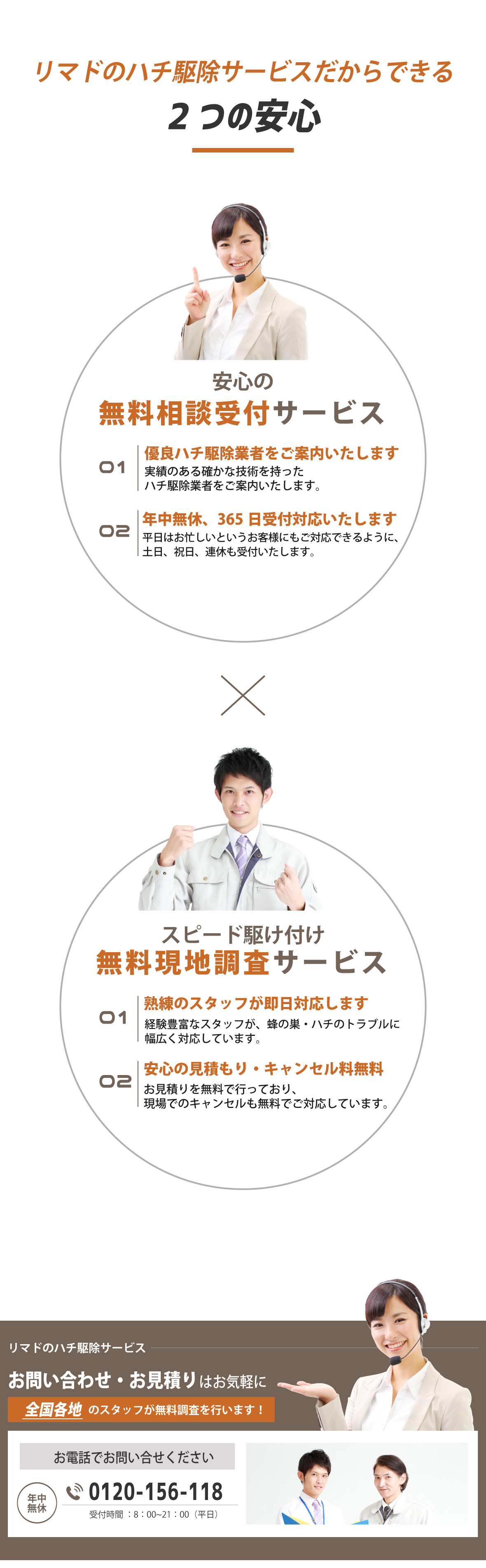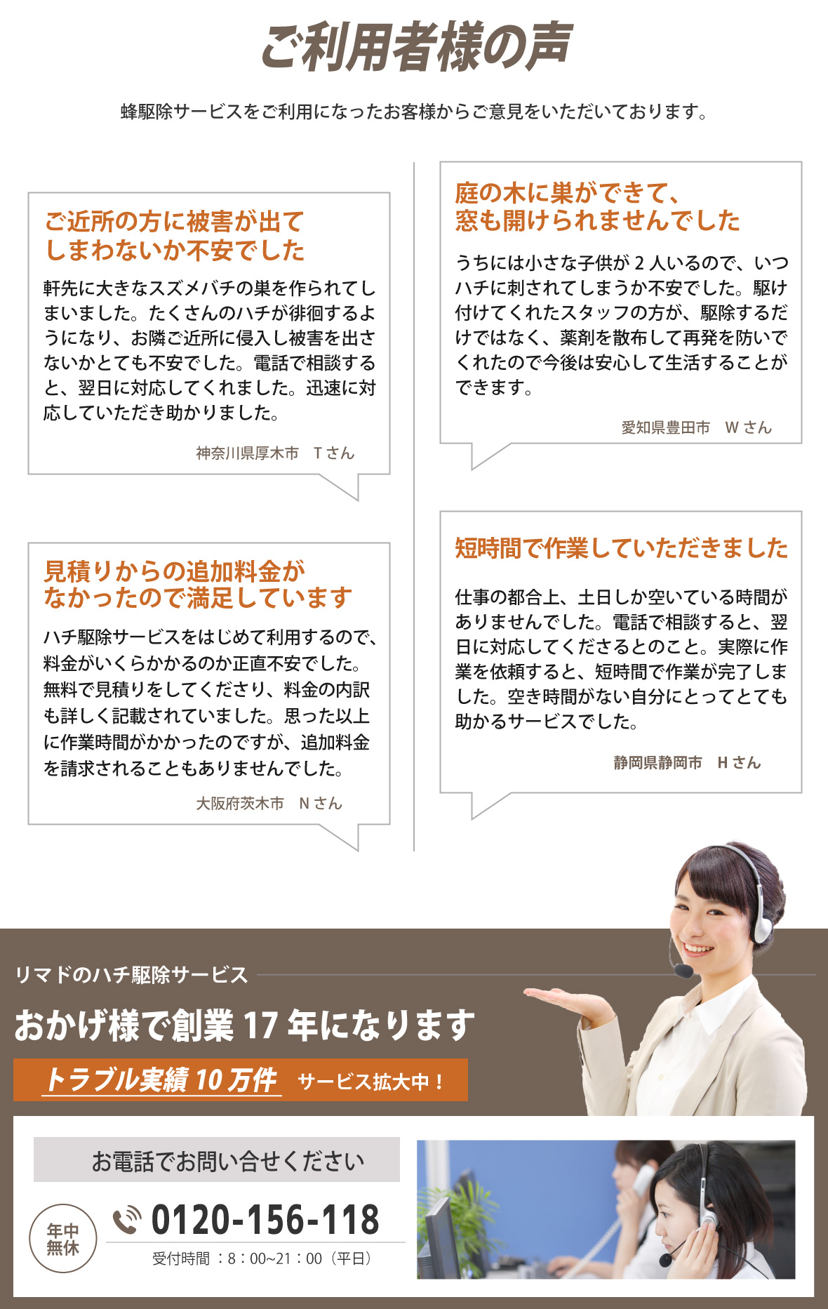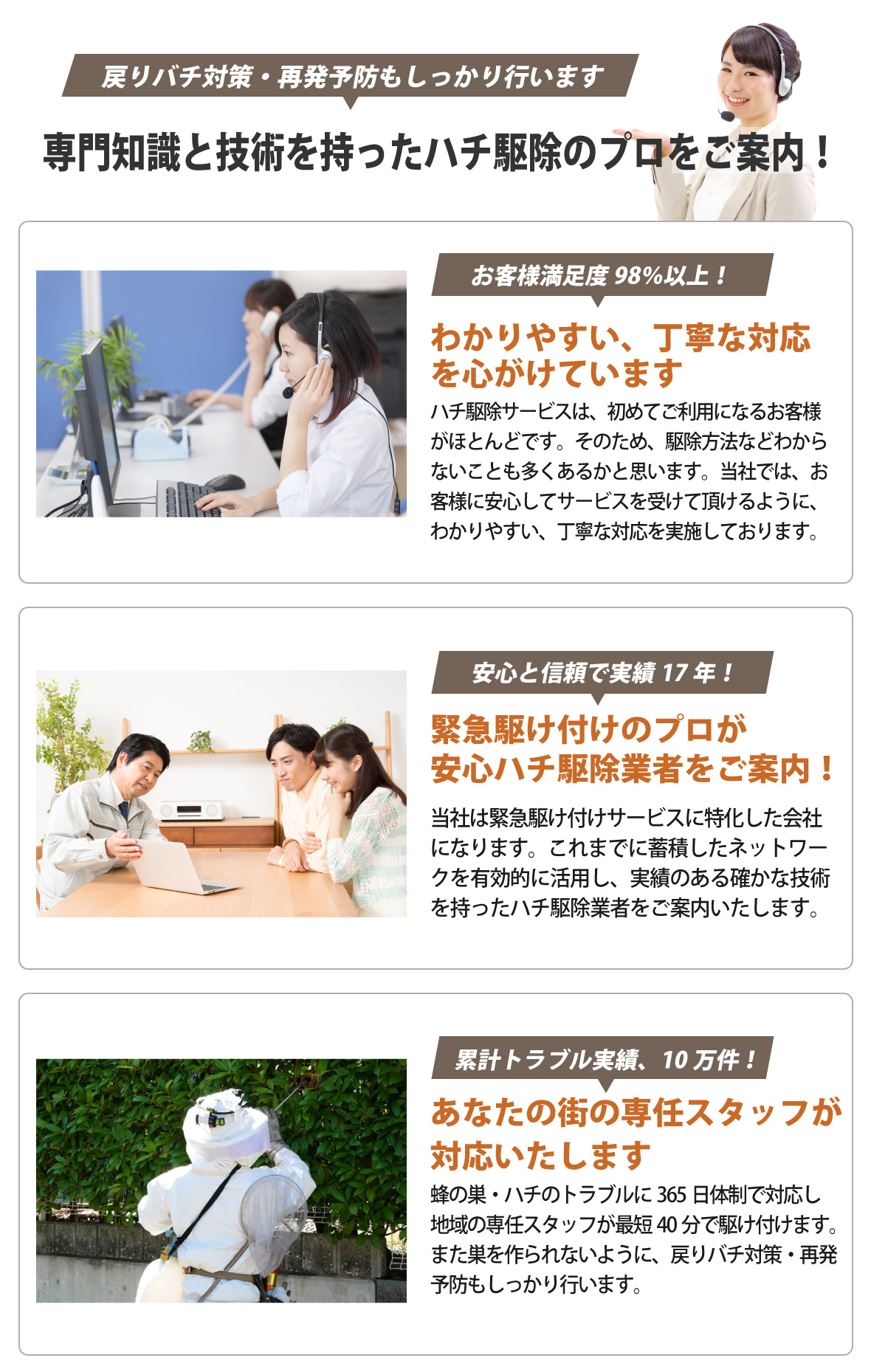 電話をかける(click)ハチ駆除をお考えの際は、プロのハチ駆除業者に依頼することをおすすめいたします。ベランダ、軒下、家の玄関や庭などにハチの巣が作られてしまうと、ハチが部屋の中に入ってしまわないか、ハチに刺されてしまわないかと心配ですよね。また家の周りで蜂が飛んでいると、お隣やご近所の方にもハチ被害でトラブル、ご迷惑をお掛けすることにもなってしまいます。そうなってしまう前にハチ駆除会社に依頼をしてスムーズに解決してしまいものです。それでは、多くの業者の中からどの業者に依頼すればいいのでしょうか?依頼を検討するにあたり、料金や対応の早さ・正確さ、アフターサービスなど気になることは多くありますよね。そこで少しでも低価格、早く、安全、安心に蜂の巣駆除を終わらせるために業者選びで知っておきたいポイントをご紹介します。まず、ハチ駆除料金を比較する際は事前に現地調査を行ってもらいましょう。駆除にかかる費用は、巣の大きさ・場所・高さ、ハチの種類によって変わってきます。また、蜂の巣は軒先や窓際といった場所だけでなく屋根裏(天井裏)、床下といった見つけにくい場所に作られることもあります。そのため正確な見積もりを提示してもらうためにも十分な現地調査は欠かせません。また、駆除の値段はお客様によってそれぞれなので、見積もり価格が業界の相場・適正料金か見極めるのも難しいことかと思います。よくあるトラブルは現地調査が不十分で追加工事・追加料金が発生してしまった、作業費用と清掃費用が別途料金で請求金額が見積りから大きく増えてしまったというものです。そこで見積もりの詳細(内訳)を納得できるまで丁寧にわかりやすく説明してくれる業者が信頼出来る優良業者といえます。また、今日中(本日中)に、翌日にでもハチ駆除を終わらせたいというお客様もみえることかと思います。そこで依頼から即日対応・即日解決・即日駆除ができる業者をおすすめいたします。そして、徹底的にハチ退治、ハチの巣除去をしてもらうために、蜂の巣駆除会社の実績も確認しておきましょう。ハチ駆除には資格や免許、許可などが必要ないので知識や技術がない素人でも作業ができてしまいます。その際、対応が不十分だと戻りバチや蜂の巣の再発といった問題が起きてしまうこともあります。実績豊富な業者であれば、ハチ駆除の知識や技術を持つ専門家のスタッフが駆除から蜂の巣の撤去・処分、再発防止のケアまで行うことができます。また、口コミやランキングサイトで業者の評判も調べてみましょう。評価の高い人気の業者、おすすめされている業者の具体的な対応や施工例など業者選びの参考になるかと思います。弊社では、ご相談、現地調査、お見積もりまで全て無料でご利用頂けます。現地調査の際は、ご依頼から最短40分で駆けつけ、緊急時にもご対応いたします。ミツバチは10,000円から、アシナガバチは11,000円、スズメバチは13,000円から適正料金でハチ駆除サービスをご案内しております。プロの駆除技術にあわせて専用の薬剤を使用することで徹底的な蜂駆除、蜂の巣の除去から、戻り蜂対策、再発予防までしっかりと行います。また、年中無休365日・通話料無料の相談窓口を設けております。ご相談には研修を受けた専門スタッフがご対応いたしますのでちょっとした質問からでも、お気軽にご相談ください。安心・安全にハチ駆除をしたい、ハチ被害でお悩みの方は、まずは弊社にお問い合わせください。